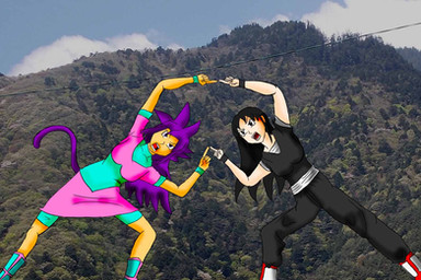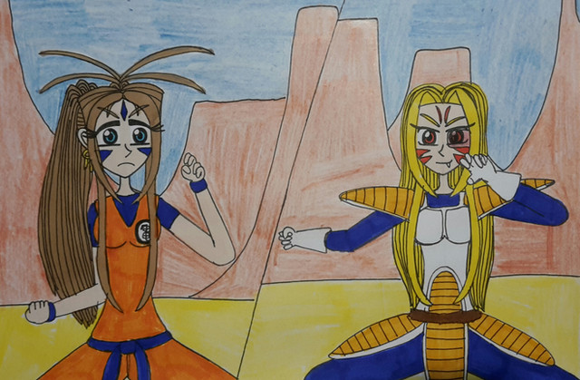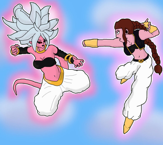 Another gift drawing. This time another gift for my friend , depicting her OC Sorita being surprised by the sudden arrival of one of the world's friendliest Majins: Majin Bara, who wants to give her a hug.Sorita = Β©