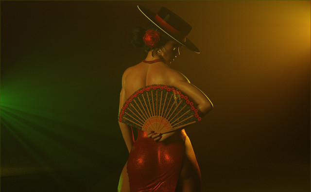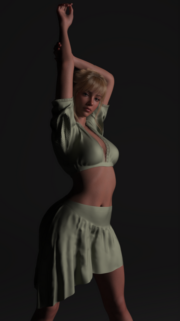 In the above image, just two lights illuminate Antonia. My experience shows that one light will almost invariably serve the function of a Fill. The other will have the dual role of a Key and Rim. The duality of this rig is flexible. Because of Rim lighting's ability to produce very dramatic effects, the other light will then take on the role of both Fill and Key. Depending on the pose and POV, this rig can become a pure 2-point system and eliminate the Key altogether. Note further, that the two lights can be anything: Points, Floods, Dramatics, Distants, Emissives, and yes, Spots. Or whatever combination suits your goal.