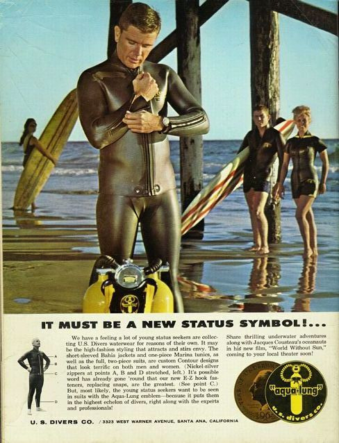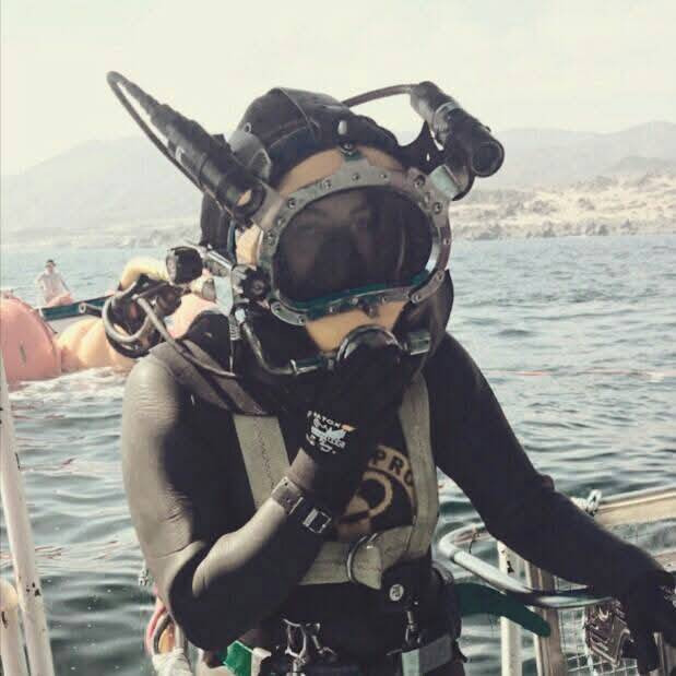 Same blonde from previous photo now in full Frogman black rubber wetsuit with hood and zip upready for underwater mission