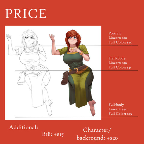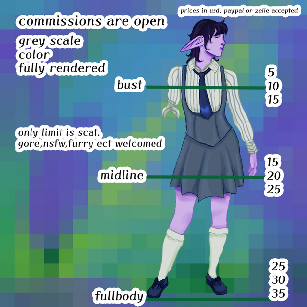 -50% of payment up front on paypal and and another half upon completion of art