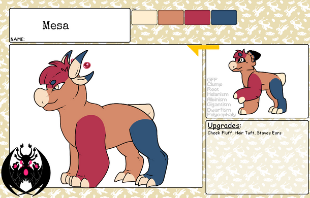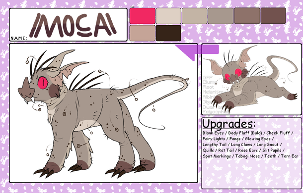Upgrades: Body Fluff, Boxy Markings, Colored Sclera, Colored tonuge, Dorsal Fin, Double Tail, Finger Paw Pads, Forked Tongue, Freckles, Full Back Wings, Glowing Eyes, Gradient, Hairdo, Heart Patch, Hooves, Long Ears, Paw Pads, Pouch, Rat Tail, Scales, Shaped Pupils, Small Back Spikes, Small Claws, Smudgy Markings, Spade Tail Tip, Stitch Markings, Teeth, Third Eye, Thumbs, Winged Ears