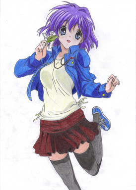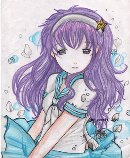I love the colours you have chosen here- the pinks, purples and blues compliment each other really well. I like how you have added some subtle hints of blue into her hair, and how you drew it swinging out behind her. However, in my opinion, the colouring looks a bit rushed in places; but as you drew this in class I can imagine that you may not have had much time ^^
