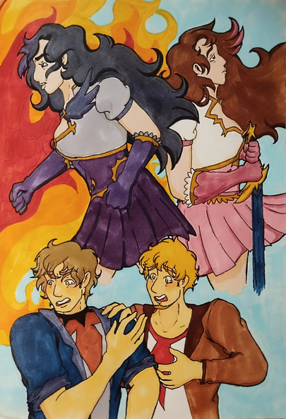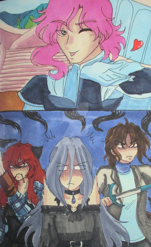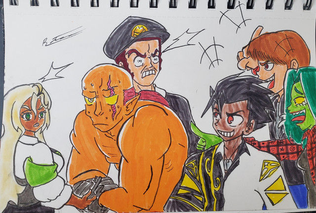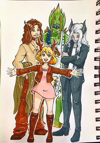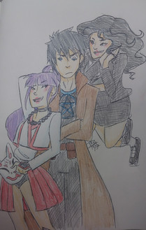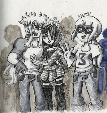 Ah... Poor Cassandra... To be the only one clipped out of the drawing, the pain that must cause... You wouldn't even know the half of it...I've been drawing Sarah a lot, and for good reason! However, I'm surprised that I'm drawing her more than I'm drawing... Wait, wait, wait, no! I'll get to that later! First! Let's actually talk about what's going on here. To make a long story short, Sarah has amnesia. In her original story, she was found by guards on patrol outside of city limits, brought into the city, and after healing, she's given a name from a name tag she was carrying, thrown out to fend for herself, and goes from job to job until she ends up becoming a part of the guard. In my version of her story, this is series of events is exactly the same. The biggest difference is that the guards who found her (Cassandra and Daniel) helped her out, out of a sense of responsibility. During this job-hunting session, Daniel would go find job leads and Cassandra would drag her along to apply. And thus the drawing. Evelyn is also here to help!