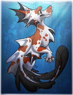 The Calico Fantail Dragon is a type of sea dragon that inhabits freshwater and is usually found in large lakes in North and South America. Its diet consists of other fish, but will hardly ever eat other kinds of meat. It lures its prey with its worm-like tongue. Unlike an actual goldfish, these creatures will attack if threatened. Their common form of defending themselves is biting and slamming with their body or tail. However, treat these dragons with respect and they will not hurt you.