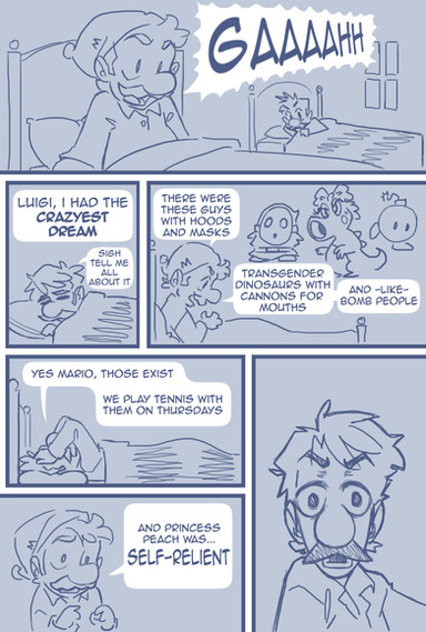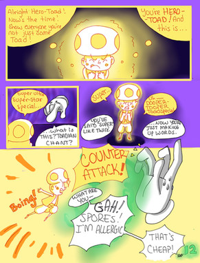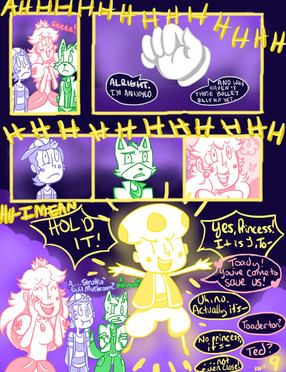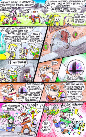 You know, I don't know about you guys, but there is a severe lack of eye-burning bright yellow on this page. What could Toader/Hero Toad/Whatever his name is be doing...? FIND OUT NEXT WEEK. SAME SMASH TIME, SAME SMASH...UH...GALLERY?Fun Fact! All the backgrounds thus far in SMASH are based off of the changing background in the N64 Smash Bros. Master Hand fight! Hmm..well I guess that means we're nearing the end...of Round 1.