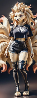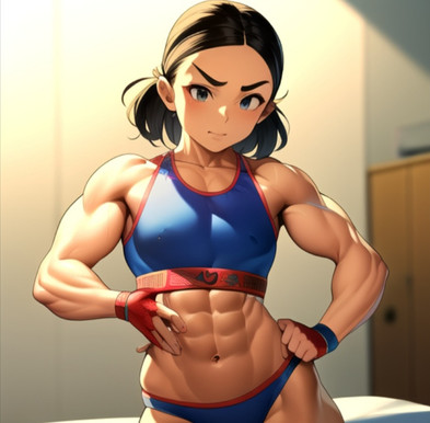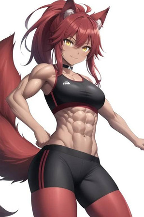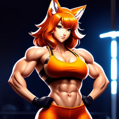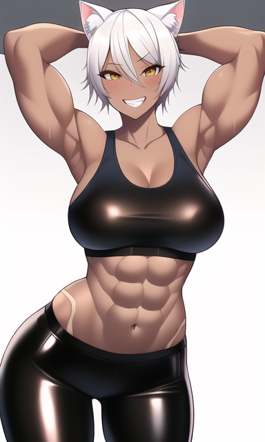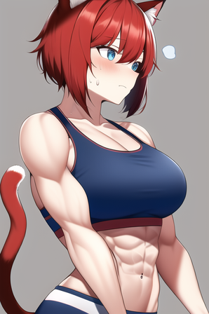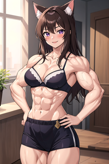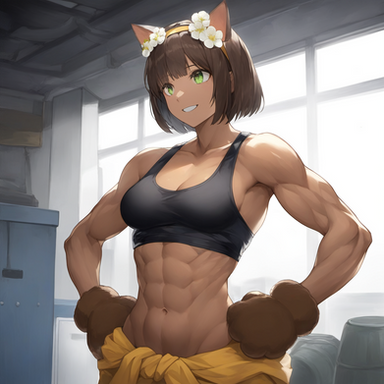 Appearance: 5' 1" tall with tan skin, small brown eyes, a round face, small cat ears, and a small nose, very short shiny brunette hair, curvy hips, a muscular torso, large breasts, and spindly legs.