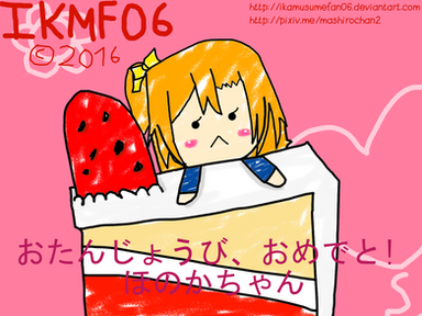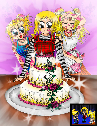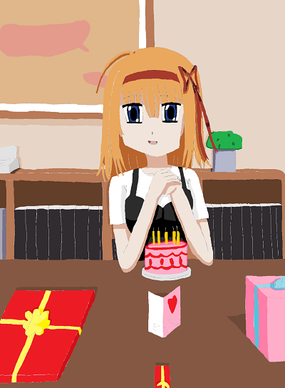 Tis another birthday cake for although I don't know if they are active here or not and I would rather make a cake for them not knowing whether they will see it or not than to not do one. I did a digital drawing as my usb is still not working plus drawing Taiga in a digital style seemed like it would be a fun thing to try out :3. I chose to draw Taiga as I drew her for the last cake I made plus the only other character I could think of for this cake was Hinata but I was not as inspired to draw her. Threw in a cloth background as I think it is a nice touch along side cake drawings although did not pattern it as brighter pink tones looked out of place against the main one.ΒFor some reason blue was the colour for the icing that came to mind, it is probably something like blue is the colour I have used the most so it just gets auto inspiration lol. There wasn't really a colour arrangement in mind for the sweets and berries I mainly just picked random ones so hope they work well together if not sorry. Taiga's head got cut off against the top icing due to how big I drew her body but I think it kind of looks cool and the only part missing really is the top of her hair.Β