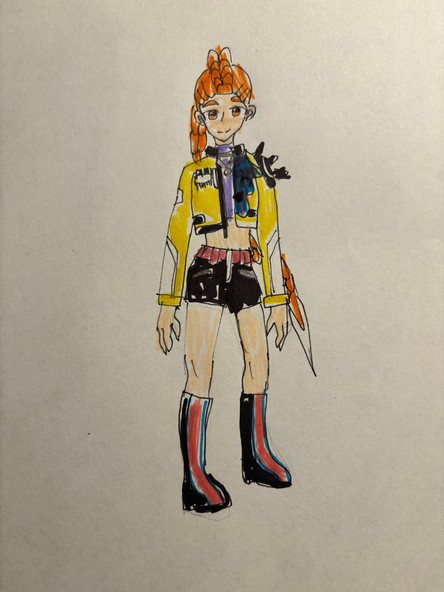 She has been on my to draw list for a while but the original plan was to do a head and shoulders drawing but I was worried about it being too simple. Then last night I looked for more pose based images and found the one used here so finally wen't for the drawing of her which I feel proud of. The bottom of the image cut off her sock (you may notice the slight outline) but I think its kind of a good thing as the bent leg looked too long compared to it. Her jacket is the main reason I wanted to draw her as the blue design with red stripes gives off a quite interesting look to me plus it looks nice paired with her shirt. Her pose came out quite cute as the bent arm by her chest and other arm going out to the side make a quite cute and graceful combo the happiness vibe worked out well =^-^=.Drawing out the legs were a bit easier than previous drawings especially going into the skirt as normally I make the features too thin but here they came out an ideal length. For her upper body I felt like I drew her too tall as I made the shirt a bit too long which bugged me thus me shorting it down a bit and I think it looked better like this. The elbows point on the right arm came one a little too thin and pointing, for the left arms width I back and forth'd a little but eventually went with a longer length. Her hair came out really cute and I think the layout of the points worked out well although I re drew them a couple of times. Her jacket was also really fun to draw especially the stripes as I think the red and blue tones flow well together, I added the stripes at the wrist section of the sleeves were a patter I added as I thought they would look cute.