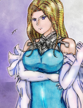 Lissa is the first healer you have and is the younger sister of Chrom as well as being Owain's mother although she is not as confident as her brother and son. I honestly was super excited by healing in this game from using Lissa in the first battle and she is not too difficult to protect the first couple of levels but as the game progresses she pretty much will get one shot'd by enemies o_o. I personally thought that Frederick was the perfect match for her due to him always looking after her and Chrom but her supports with Lon'Qu are cool too as he learns to enjoy her company which is so sweet as Lissa a lovely character :3. I honestly have a lot of fun grinding levels for her early game cause healing is so good and helpful due to early enemies being weak.I had a lot of fun with the colouring due to her dress being yellow and her hair blonde due to my love of yellow :3 which is one of the reasons I like her as a character. I think her pigtails are really cute but in this drawing I don't think I made her hair sections pointing upwards look as natural as the ones pointing downwards o_o. I also brought back the green text for healing but at a lower number due to this games health system but still green healing text ftw