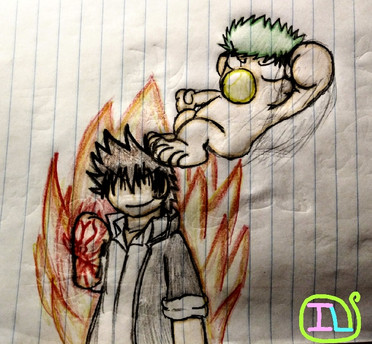 So I'm now addicted to a theme from a game and while listening to it I had the idea to draw this scene where basically the main has to guess which of 3 cards is the same type as his deck (his one being fire). Also I always imagined Zen Flow cards having their back colours match the type of card they are but this drawing has single handily changed my mind on that. I do typically have characters acknowledge a type after a monster is summoned so that would not make sense if they could tell from the back colours. After this drawing I kind of want to do another video game like scene just don't know what I would do next yet o-o, I always use the male main for drawings since female was used in a story.I chose a bar scene as I thought it would look interesting but then I realized it probably seems weird, I did give the main a can of juice to show other drinks are served o-o. I think the bar counter looks good just I didn't have the patience to draw a complete background behind the bar tended, I started this drawing last night thus me posting something more time consuming earlier lol.
