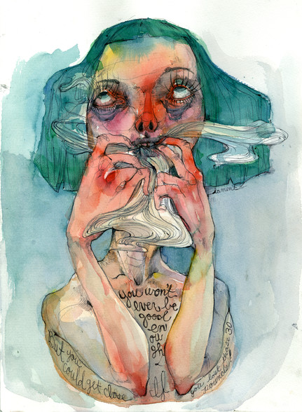 I use varying amounts of water, and usually spend hours making layer upon layer to achieve the desired affect. Certain colours, though not appearing to be very bright on their own, appear much brighter when used with certain others also.