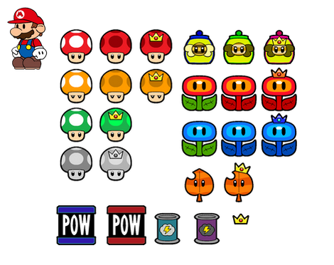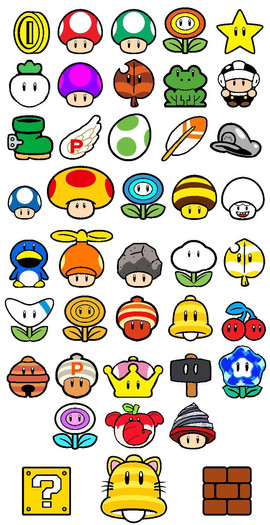 This is for Joshuat1306.Here's all the Mario items including the Vanish Cap, Wing Cap, Chicken Suit, Metal Cap, Super Cape, Giga Mushroom, Feather, Hammer Suit, Kitsune Leaf and Tanooki Leaf.
