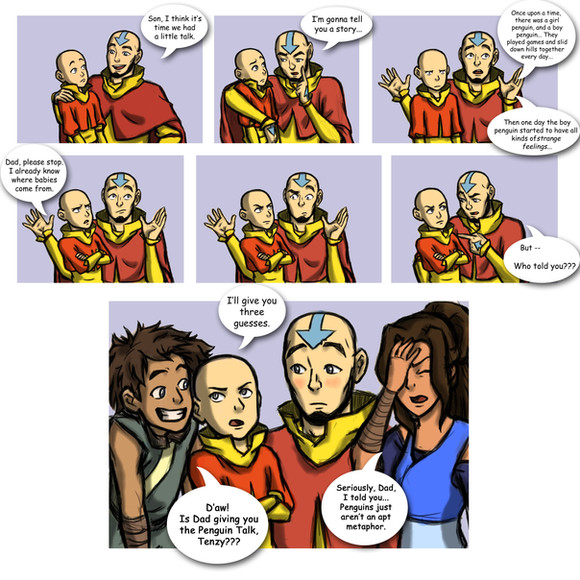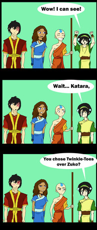 The first panel is also well done, as it provides a good build-up to the joke, and it also has a nice little background joke with angry Katara and confused Haru