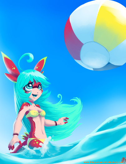 Hahah, this one jumped out at me the moment I saw it in my Message area of DA. The rainbow beach ball was the first item that caught me, and then I noticed the smoothness of the characters and the fun that the two of them were having. Add in a lovely background complimented by bright and warm colors, and you have a piece that's fun to see!