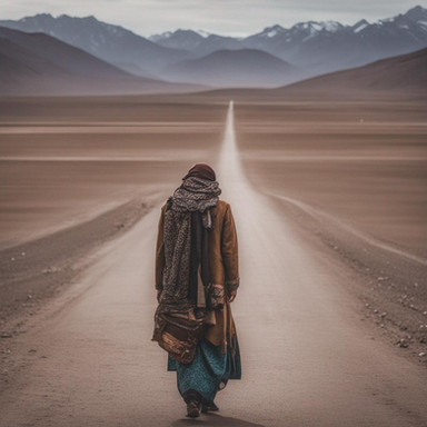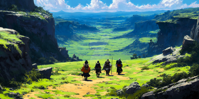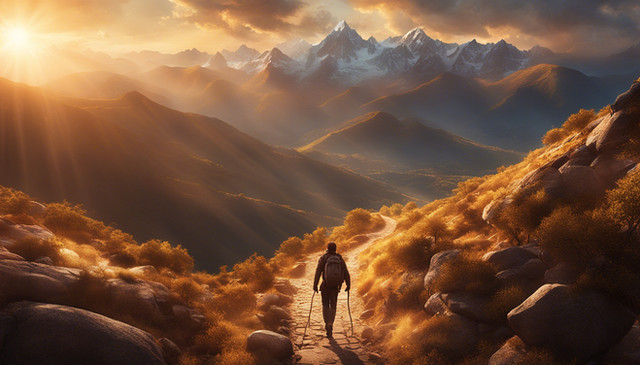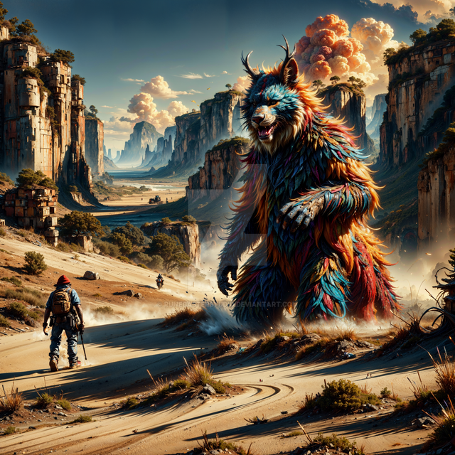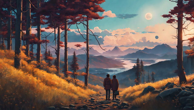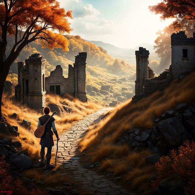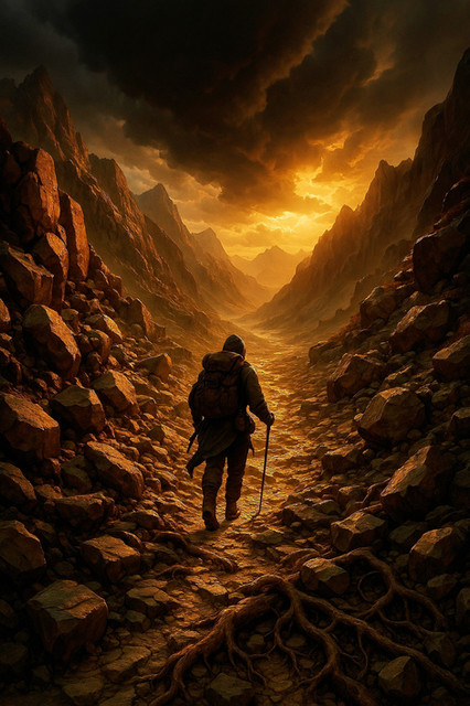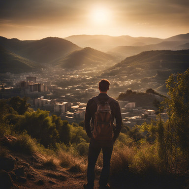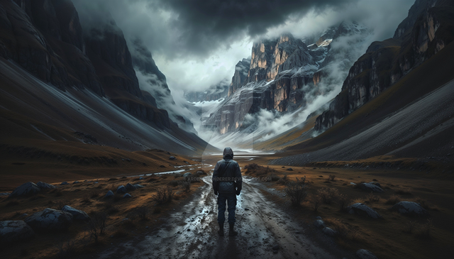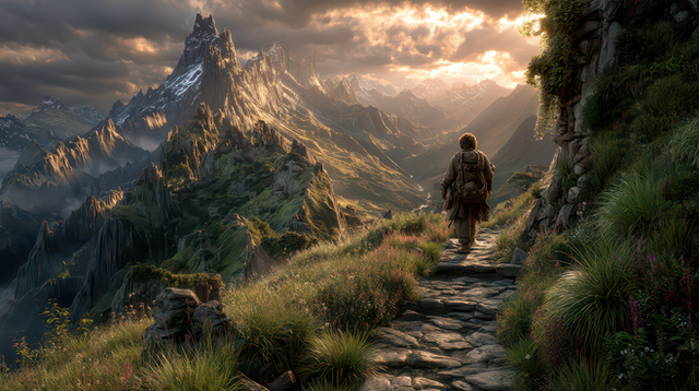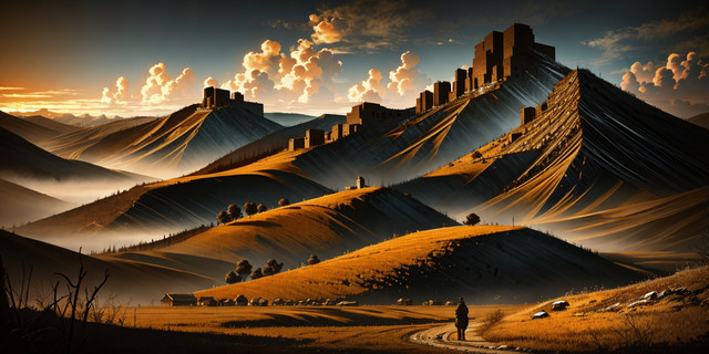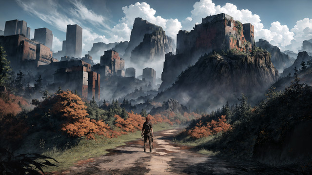 #hiker #hiking #mountains #path #road #ruins #trees #valley #digitalpainting #fantasyillustration #painting #photorealism #photorealistic #skyscrapers