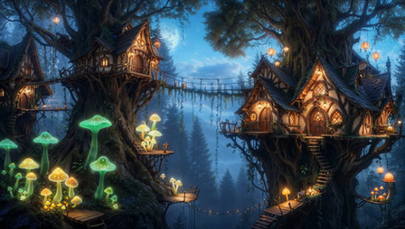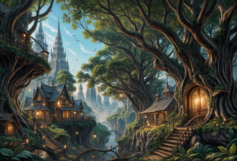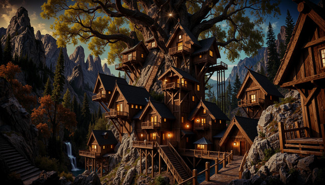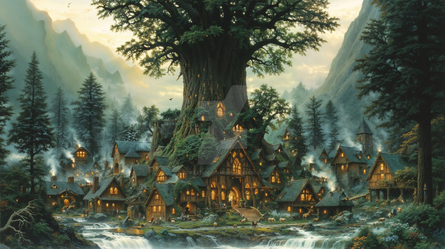 #building #construction #fantasylandscape #forestfantasy #lordoftherings #lorien #lothlorien #lotr #photorealistic #wallpaper #woodelf #woodsforest #threehouses #absurd_res #4kwallpaper #galadriel