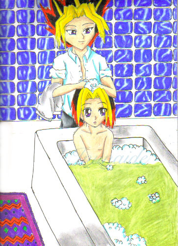 Anywho... Mikaeru-Sama's going to take a bath...he didn't know anyone was in there and LO! He finds his oldest son, Baby Flame taking a bath with a..... RUBBER DUCKY??