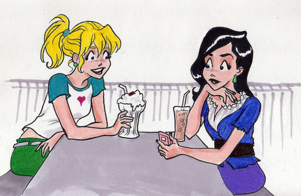 There are times where Betty and veronica can set aside their rivalry and can be friends. I wish this was shown more often because I think they could be really close.this illustration is a redraw from a 1980's Betty and Veronica comic book cover.