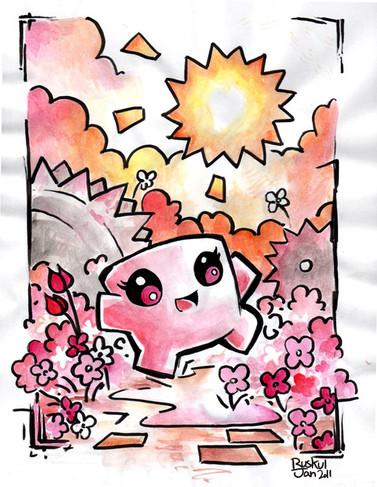 Really like this style... not sure if it's new or just something you re-vamping but I like it Only thing I suggest is more background. It's hard to tell that it is painted with water color so maybe repeating the bright color scheme in the background can really make this picture pop.