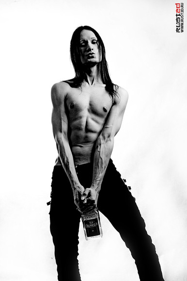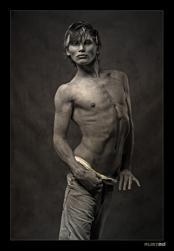 i love the movement - his abs all tensed, his hair flying, the jacket suspended, the jeans stretched. interesting cropping, i wouldn't have thought of it as being so damn effective. any particular inspiration?