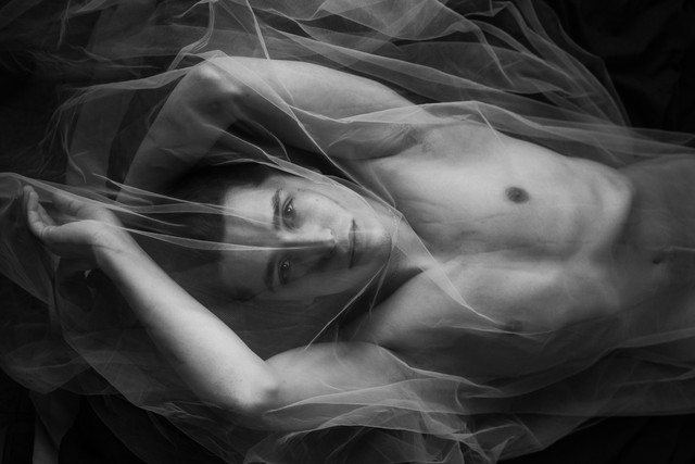 Getting the details on this - like the folds of the sheet and the pearls - you manage such clarity while maintaining that dreamy state (thanks to the textures around him and the shadow play of the dark to the right of him) is such a job well done. Doesn't hurt that the model is dishy. Excellent job.