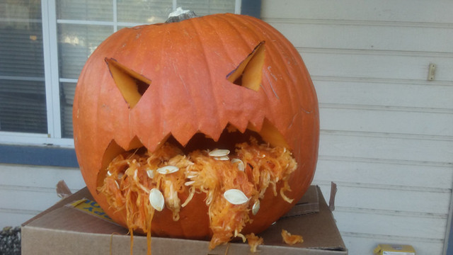 Thanks! One year I could buy a pumpkin in time, so I had to make a Barfing Cyclops Crenshaw Melon. It wasn't quite the same...