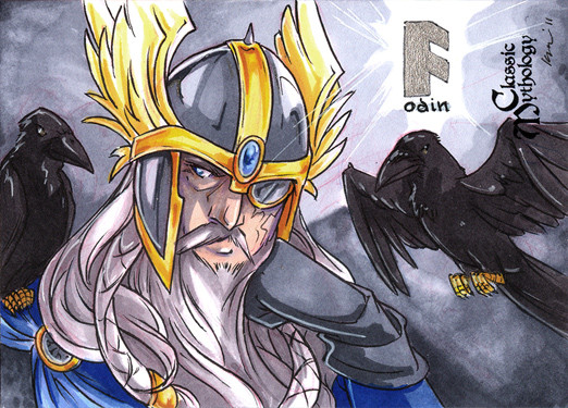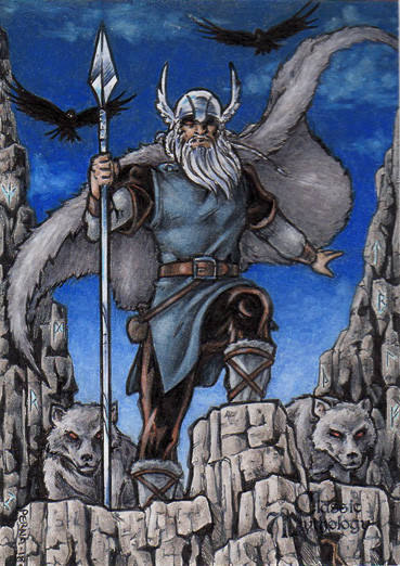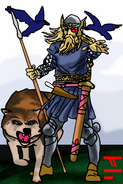 Well, my first sketch I had Odin with a winged helmet, but I discarded it after I drew one of his wolves and it looked really awful. I had no reference to sue when I was drawing them, and I'm no anthro artist. I just winged it the best I could, and I still think the one standing by Odin looks more like a coyote. I did use a reference coloring them though, so I am a bit pleased how they turned out. Just plain gray or black wolves would've looked too...cliche I think.