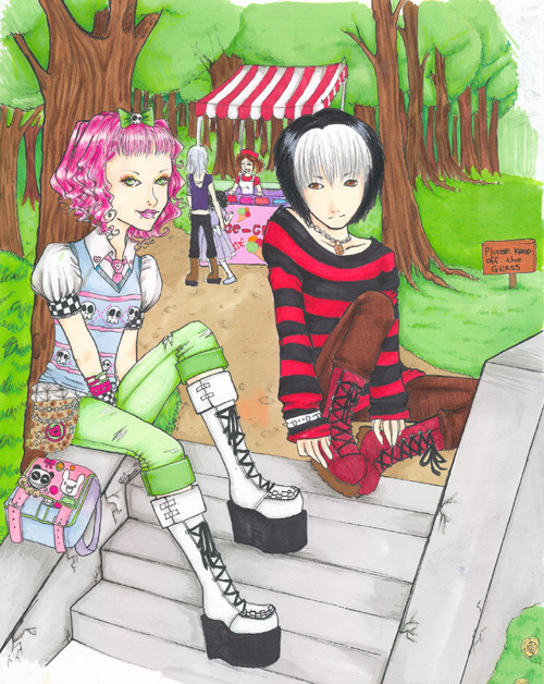 i scanned the drawing about a week ago and have been working on it on and off in Illustrator. such a yummy programme < 3 the characters are just two random kodona and lolita peoples that i had the urge to draw listening to plastic tree and TBM. hoho. also a pinch of NIN 'cause With_Teeth pwns me.