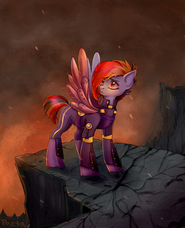 ahh wow, this looks absolutely wonderful!! the clothing folds are done really well; it gives a nice look to the sweater. the mane and tail looks fantastic as well. i love the way they flow, looking like they're in motion, and the flyaway hairs really look nice! her pose is really cute, as is her expression!! the shading looks great! i really adore the style you use for shading, the way you can see all the different shades of color. the white highlights look nice and add definition. lastly, i really like the background; i like how the colors match and the way the shadow is done. ahh this looks beautiful, as always, rusty!