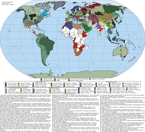 - A rump USA (here, called the Federal States of America), naturally led by a Putin expy. Has a few unrecognized "Yankee" statelets, like Delmarva and parts of Kentucky and Missouri, as something like Abkhazia or South Ossetia. Also has New Orleans (possibly renamed) as an obvious Kaliningrad expy, and because it's likely that the Americans would want to keep the mouth of the Mississippi at all costs and ship a lot of Americans down there. I don't see any parts of the pre-FGW United States breaking away (except for Deseret).