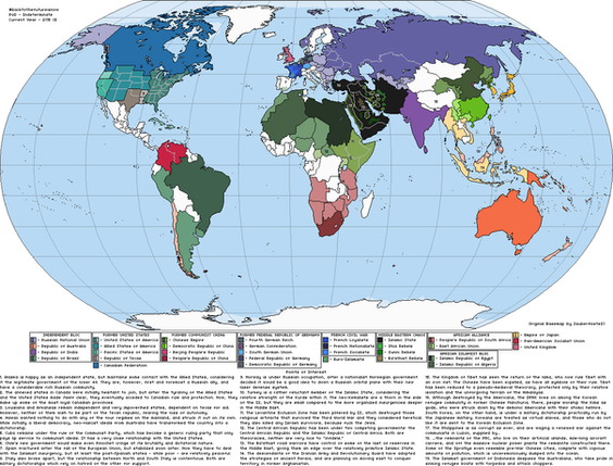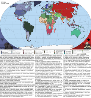 The Japanese Empire is still around, acting as the People's Republic of China. Actually, the German Empire is around, too. In response to the Population Reduction and the violent occupation of the South and Canada, the Germans actually took steps to liberalize their colonies and integrate them. It wasn't totally successful, but a dominion-style system has replaced the old colonial system. Funnily enough, the "Shadow War" was a conflict between republicanism (USA) and monarchy (Germany, Japan)*, with republicanism losing because it was acting too oppressive and hypocritical.