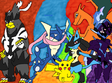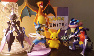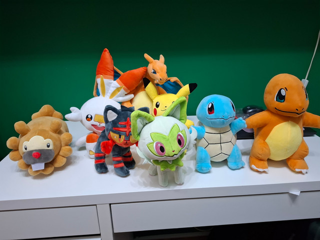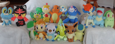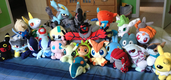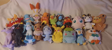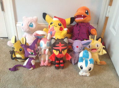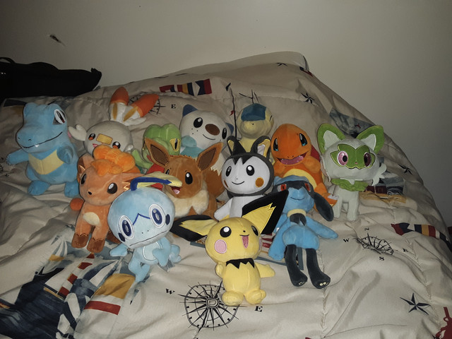 I thought I show you some of my Pokemon plushies. All seven of them are on a rocking chair in my bedroom.Amazon: Greninja, Lucario, Charizard.