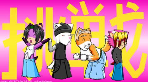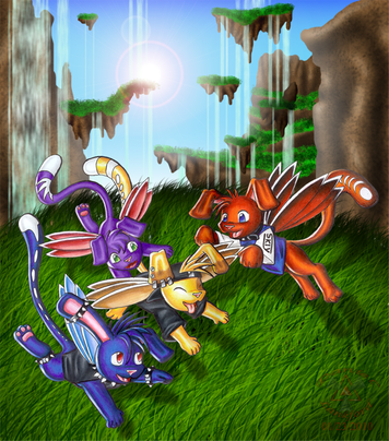 Wow, there are so many neat chars here.. I'd have to do fanart if I wasn't so busy.. XD I love this cute style, and all of their clothes are awesome! I think it makes a nice wallpaper too. X3 I love Ryan flying in the background randomly. XD