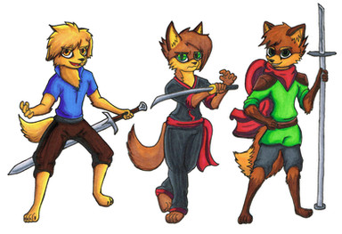 No one really needs pants, do they? The red vulpine on the left has some great colors on him, both fur and shirt. His staff looks like it could be nice and painful. Live the determined squirrel's foresty colored cape. Looks like it was made with watercolors. Matches his eyes too. The red eyes feline has a really nice shirt. He looks so happy. The sky-eyed lupine has a nice hue-jazz sword. If an enemy somehow somes in close he hould just whach them in teh face with his spikes. The raccoon just makes me want to laugh.