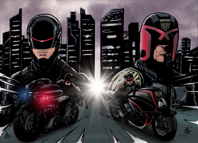 I had a blast coloring this, I loved how I was able to add the buildings and layers of light to this piece! All in all, Terminator would win this one!