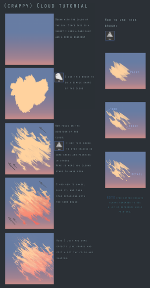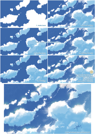 This looks good, but this is actually a bad example of a tutorial, especially for beginners, who do not exactly understand the drawing concept of clouds, yet. Explain maybe, why you color the clouds like that and what purpose they fulfill.
