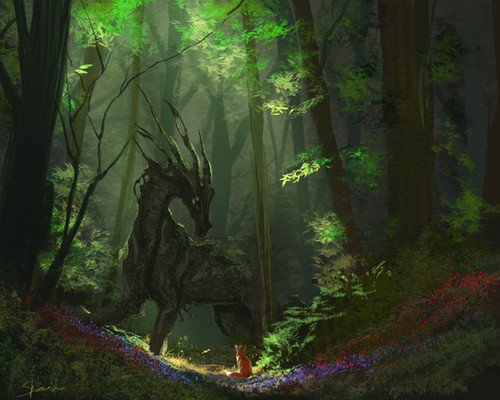 Holy, exquisitely magnificent! The Enchanting Dragon is stunning and The Ryky Character looks incredible! The forest, expressions, poses, wings, spikes, trees, leaves, plant life, movement, effects, glimmer, sunlight, interaction, light focal points, field, perspective, atmosphere, textures, hues, concept, composition, uniqueness, lighting, colors, style, and other details are also wonderful! Amazingly beautiful work!