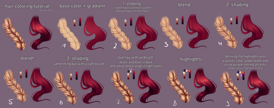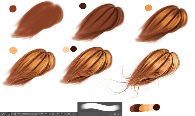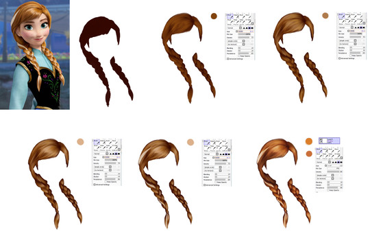 To be honest I think the tutorials are quite good. You can easily pick up that the artist has basically added on layers of coloured paint strokes (becoming lighter) to create the effect of the hair. It's not that difficult to pick up. It's up to you to decide what colour schemes you would prefer to add, and even how to apply the strokes.