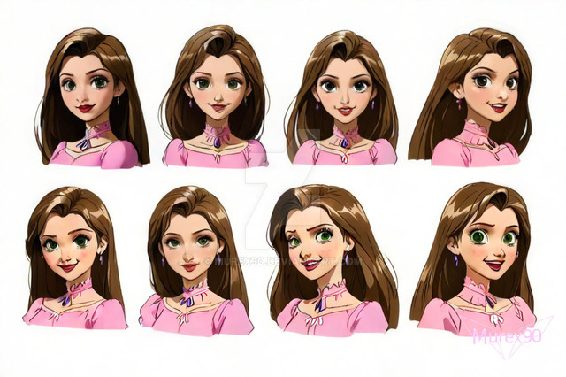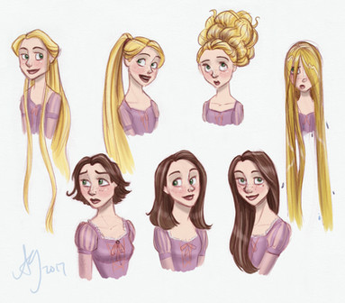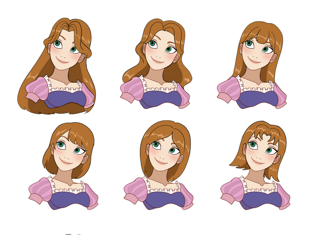 Since Rapunzel is originally brunette, she would probably look more like the bottom left picture. So it's interesting to see what she would look like with long brunette hair instead of short.Β
