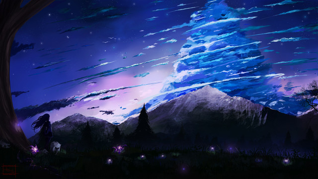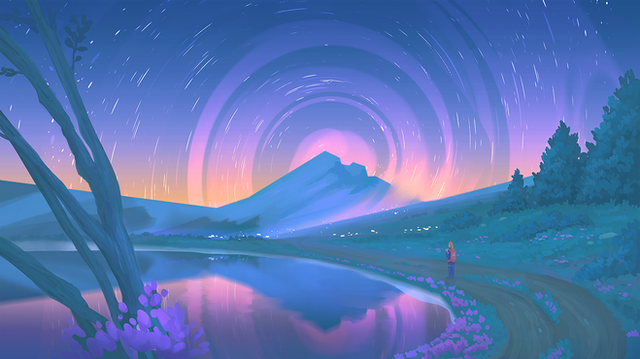 i really like how background is really dark blue and the character and the lights are light yellows and oranges, it gives a reaaally nice contrast and its just so pleasant to look at!
