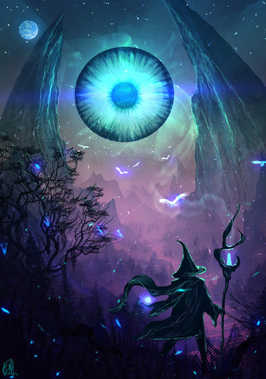 Holy, epically sensational! This Majestic Ultraviolet Eclipse is stunning and The Landscape looks incredible! The designs, Totoro creatures, sage master, scepter, mountains, ledges, cliffs, crevices, pathway, terrain, robe, hat, grass, flowers, trees, plant life, interactions, sky, clouds, flock of birds, solar ring, gleam, glow, magic, flow, movement, effects, perspective, realisticness, atmosphere, hues, textures, concept, composition, uniqueness, colors, lighting, style, and other details are also outstanding. Amazingly Radical work!