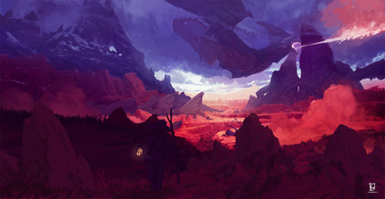 I feel like it could've been a more dramatic piece if you would've placed the staff-wielding character closer to the viewer, around where the tree is now but in the foreground. This would create a nice balance in the image as well as bring your attention from the character and then towards the flying demon/dragon! I know you love to add a lot of glow and shine to cover up the lack of proper composition but I do think that you can do great things if you really tried!