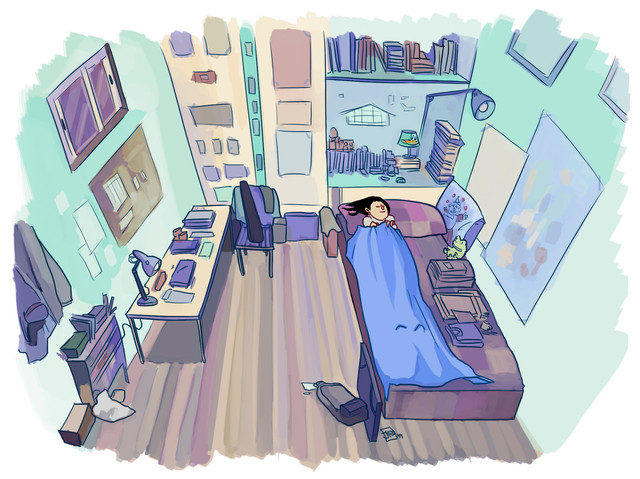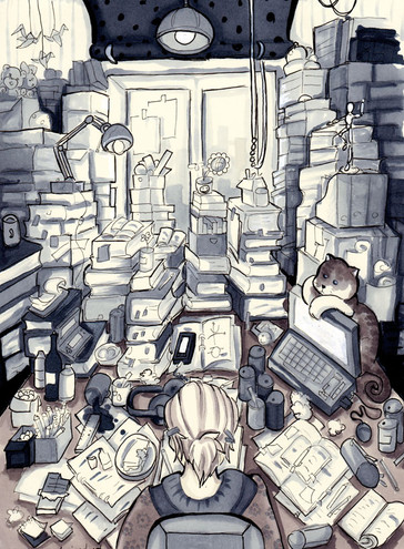 Ha!I imagined what I/my job could be like in the future. I'd have a decent house/apartment with a nice art studio that is cramped with drawings, books, art materials etc. (as shown in the drawing-------)