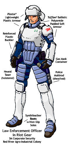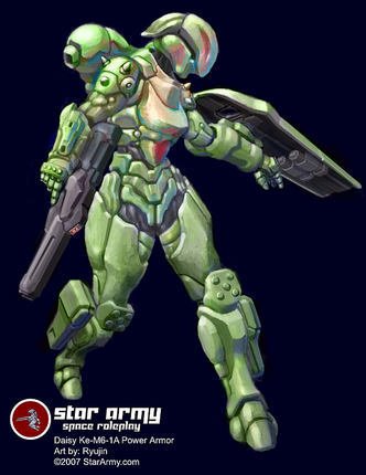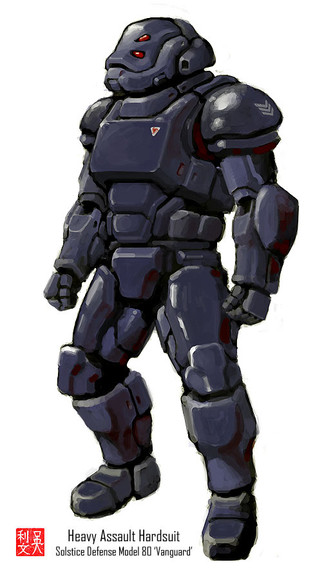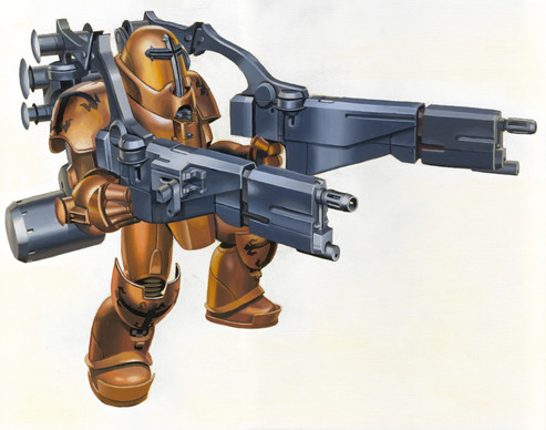 Concept for Light "Angetriebene RΓΌstung", little more than awkward suits of heavy powered armor whose occupants can only manage to walk and aim because they're ubergrenadiers. [Germany]MG-42's a homage to the Kerberos Panzer Cops & the Colonial Marines smartgun. I presume that the suit is powered by a modified motorcycle engine.