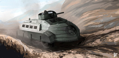 The depicted hovertank is an FMC Halvizard, named after a pseudoreptilian predator indigenous to the planet Grant. It follows the general layout of most hovertanks and flowtanks, with an unmanned, modular turret and a 2-man crew compartment occupying the rear of the hull. The main weapon is a 75mm coilgun with a secondary 15mm co-axial weapon. With the proper equipment, the main gun can be quickly reloaded by replacing the ammo cassette through the rear of the turret overhang. Recoil from the main gun is handled by a combination of vectored counterthrust from the tank’s propulsion system and an electromagnetic recoil buffer system.