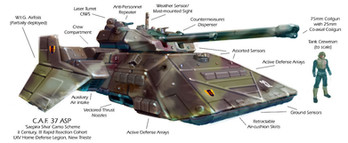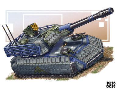 The turret is thickly armoured along its frontal arc, although it does have a higher profile than many other tank turrets. As additional protection, the turret is liberally covered by appliqué armor plates of the passive type, a mix of composites and ablative material designed to absorb & dissipate directed-energy weapons fire. Defensive armament includes a 10mm coilgun repeater and a point-defense pulse laser. A mast-mounted sensor & countermeasures system is installed in a small turret mounted on the overhang.