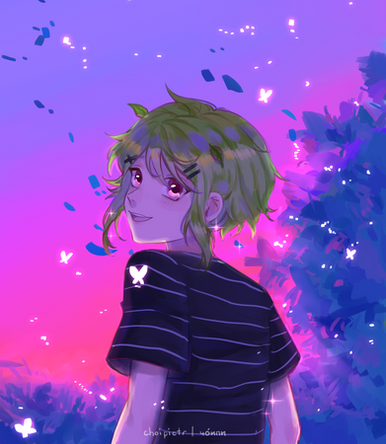 #anime #animeart #artwork #blonde #blueeyedgirl #chromatic #digitalart #digitalpainting #dramaticlighting #girl #night #oc #shirt #smoke #ahoge #art