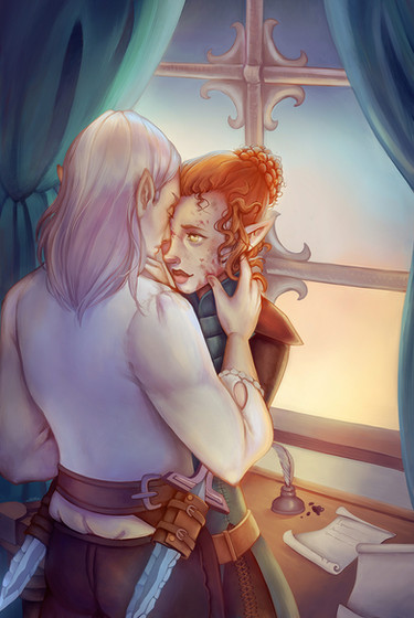Another Dragon Age tarot card, this time for lamentaslair on tumblr. (:I ended up taking inspiration from the “Justice ” tarot card (the sword & the scale), and the “Lovers ” one (the wings) and combining their meanings somewhat. I was also instructed to use a lot of dark purples, and I happily obliged