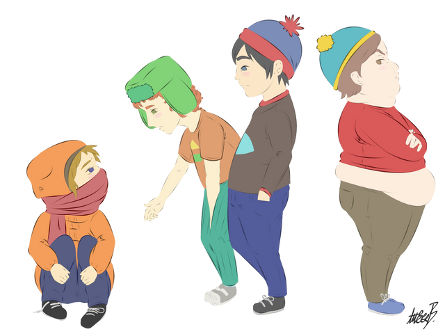 What I love to do unlikely of what they do in the series is showing the height differences between the boys. I always imagined Kenny to be a little more scrawny and smaller than the others.