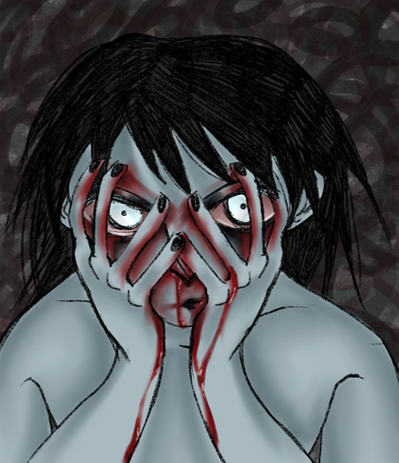 I did the bloodstains by colouring the BG blue first then got a bright red and scribbled it on, then i coloured over some of the red bit with the blue. i move the green bar to 100% and smudged the red and blue together ^_^ (done using the watercolour tool on opencavas) er... did that make any sense??